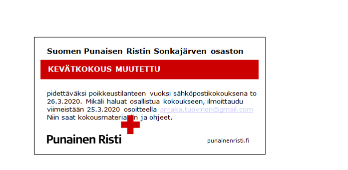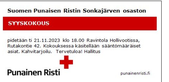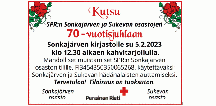 Sonkajärven osasto on toinen kunnassa toimiva Punaisen Ristin osasto. Meillä on reilu 80 jäsentä, joista aktiivisia vapaaehtoisia on reilu kolmekymmentä.
