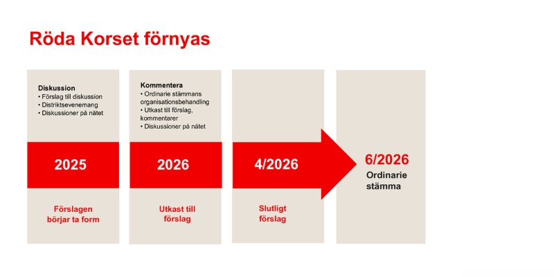 Förnyelsen är en gemensam möjlighet för oss alla. Den är ett tillfälle att skapa ett Röda Korset som är ännu effektivare och fungerande, och som är nära både hjälpbehövande och hjälpare. Kom med – ett starkt, effektivt och humant Röda Korset skapas tillsammans!