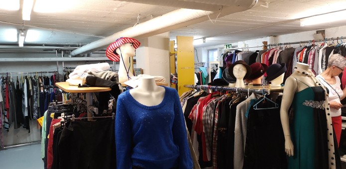 Alakerrasta löydät lasi- ja posliinitavarat, kotitaloustuotteet, naisten, lasten ja miesten vaatteet, kengät ja laukut, kirjat ja äänitteet sekä urheiluvarusteet.