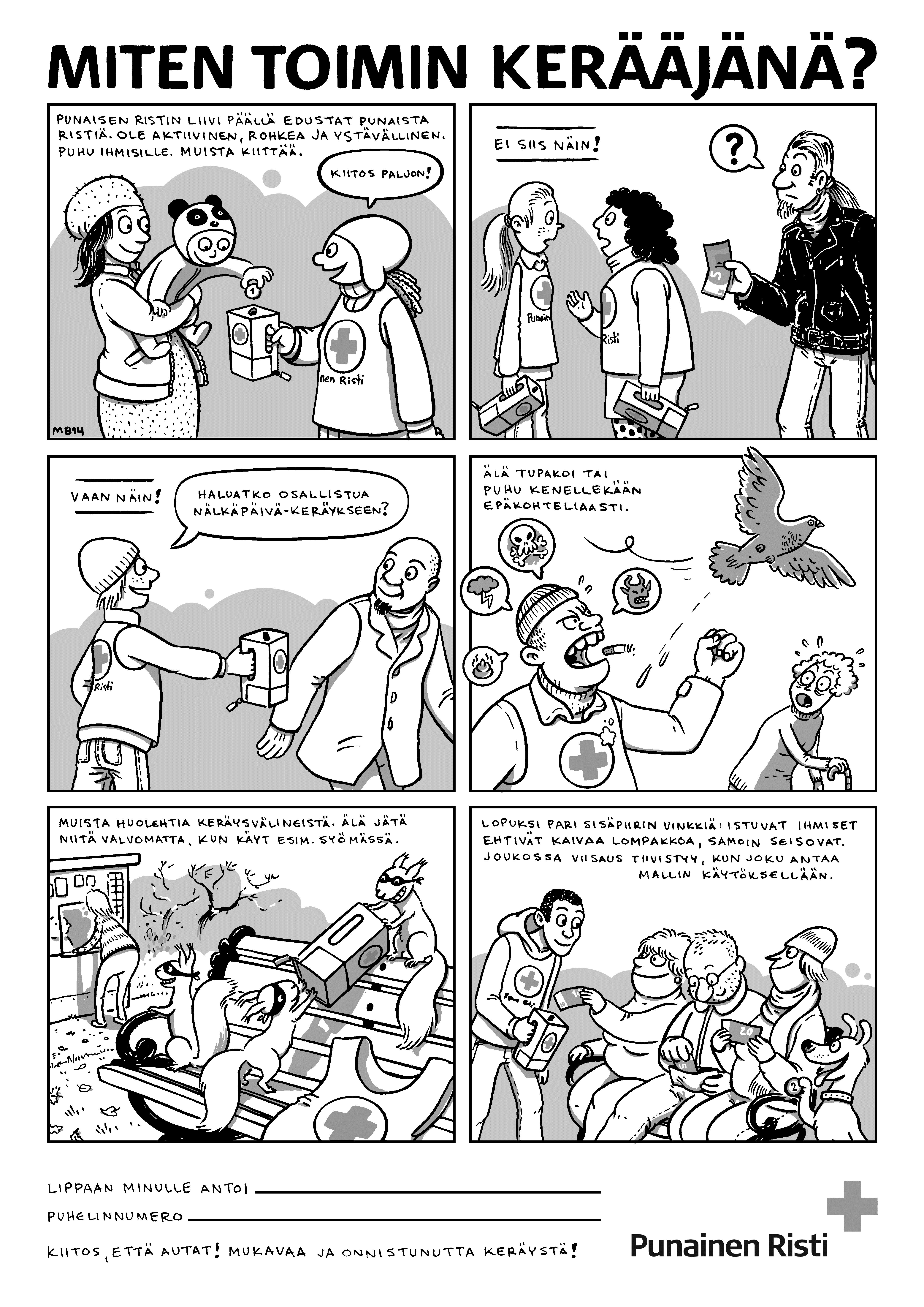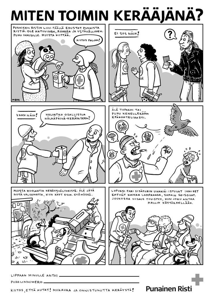 Voitte tulostaa sivun alalaidassa liitteenä olevan sarjakuvaohjeen jaettavaksi kerääjille. Rasteroitu versio toimii mustesuihkukopiokoneisiin ja tulostimiin, tavallinen versio uudempiin tulostimiin.