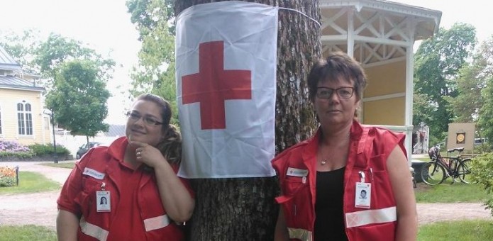 "Naantalin Kirkkopuistossa ensiapupäivystämässä 9.6.2014, Naantalin SPR osaston ensiapuryhmäläiset Katja L. ja Riitta S."