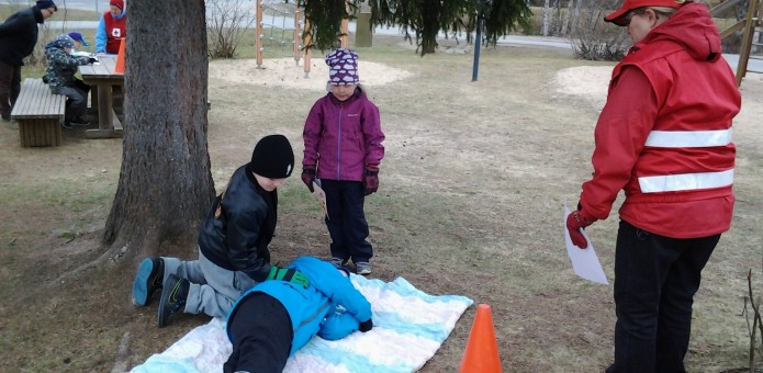 Rasteina oli varoituskolomion kokoaminen, ensiapulaukkuun tutustuminen, hätäilmoituksen tekeminen, vierasesine hengitysteissä - toimintaohjeet, tajuttoman kääntäminen kylkiasentoon, vuotavan haavan sitominen ja palovamman hoito.