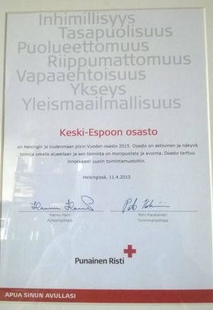 Olimme Punaisen Ristin Helsingin ja Uudenmaan piirin vuoden osasto vuosimallia 2015. Perusteluina kirjattiin: "Osasto on aktiivinen ja näkyvä toimija omalla alueellaan ja sen toiminta on monipuolista ja avointa. Osasto tarttuu innokkaasti uusiin toimintamuotoihin." Allekirjoittajina Hannu Harri ja Petri Kaukiainen.