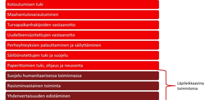 - Kotoutumisen tuki: vapaaehtoisten tehtävinä mm. ystävätoiminta maahan muuttaneille, läksykerhot, asumisapu, kansainväliset klubit ja leirit