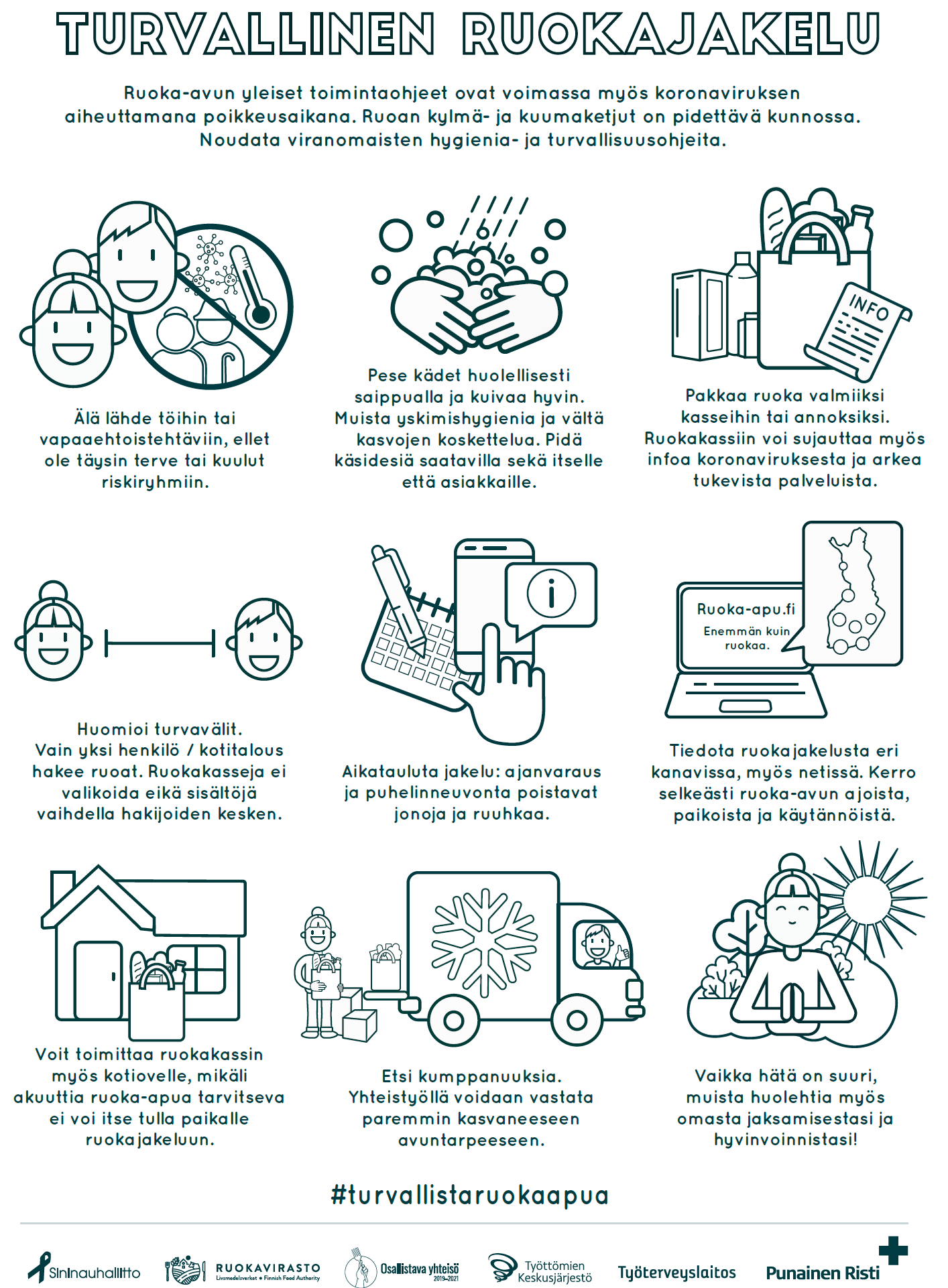 - Ruoka-apua koskevia ohjeita ja käytäntöjä löytyy Ruokaviraston sivuilta ja https://ruoka-apu.fi/korona/