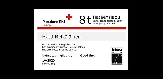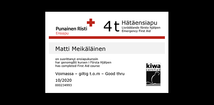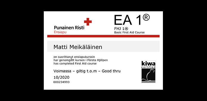 Kaikki ensiapukoulutuksemme ovat voimassa kolme (3) vuotta. Mikäli kurssisuoritus on päässyt vanhentumaan, tulee ensiapukoulutus suorittaa uudestaan. SPR Ensiapukurssi EA 1® tai SPR Ensiapukurssi EA 2® -pätevyyden voimassaoloaikaa voi pidentää kolme (3) vuotta suorittamalla Punaisen Ristin koulutusohjelmien mukaisen SPR Hätäensiapukurssi 4t® ennen pätevyysajan umpeutumista.