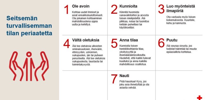 Täältä voit lukea lisää turvallisemman tilan periaatteista: https://rednet.punainenristi.fi/turvallisemman_tilan_periaatteet
