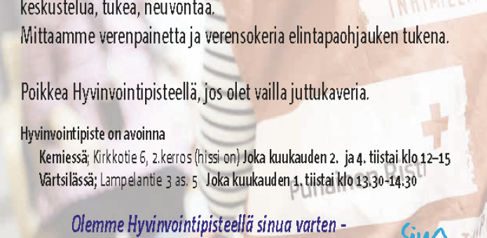 Kemiessä; Kirkkotie 6, 2.kerros (hissi on) joka kuukauden 2. ja 4. tiistai klo 12–15