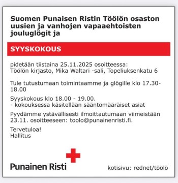 Normally we are looking for volunteers especially in the following areas: member and volunteer communications, friend volunteering, development of emergency preparedness and development of donation collection. Please contact toolo@punainenristi.fi for more information.