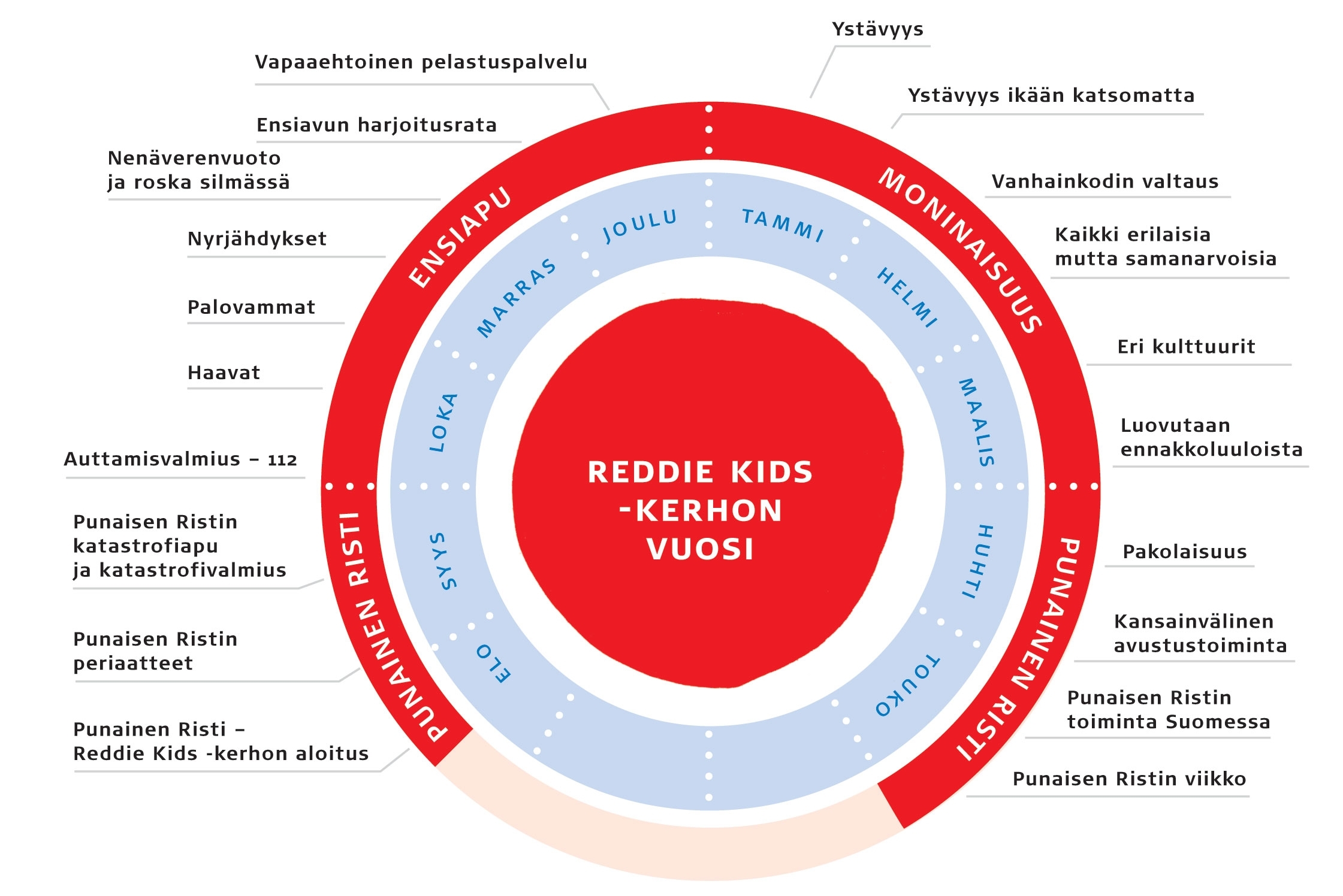 Kerhoissa käsiteltäviä teemoja ohjaa vuosikello. Ensimmäinen vuosi on maksuton. Suomen Punaisen Ristin jäsenille maksuton jatkossakin.
