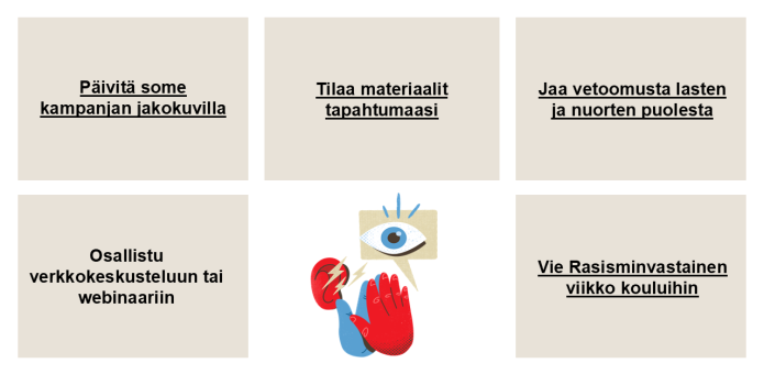 - Kampanjan toimintaohjeet on koottu tänne: https://www.punainenristi.fi/rasisminvastainen-viikko/toimintaideat